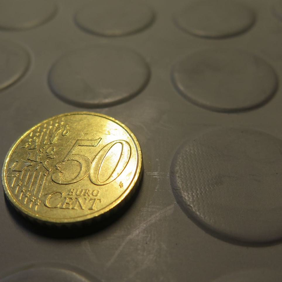 Oberseite: Flache runde Noppen, ca. 1 mm über der Grundmatte. Der Durchmesser der Flachnoppen beträgt ca. 23mm.