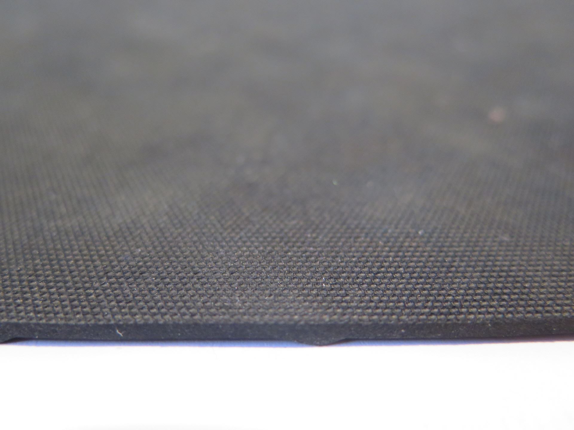 Unterseite: Feine Mikrostruktur, ähnlich eines Leinenstoffs. Dieses Muster verbessert die Haftung und erleichtert eine gegebenenfalls gewünschte Verklebung. Durch die spezielle Struktur kann der Kleber eine bessere Verbindung mit dem Gummi eingehen. Die Verklebung wird dadurch deutlich vereinfacht.